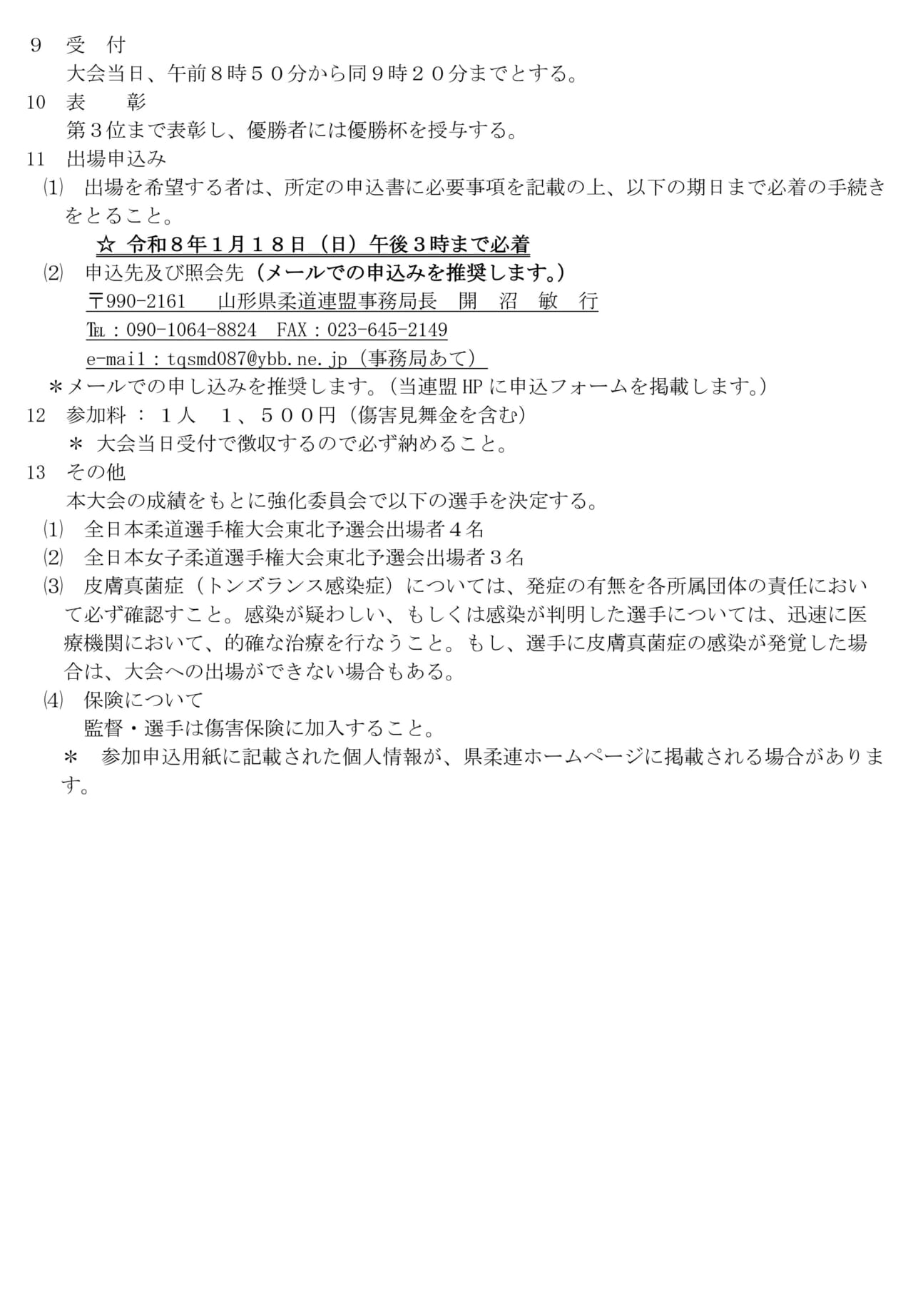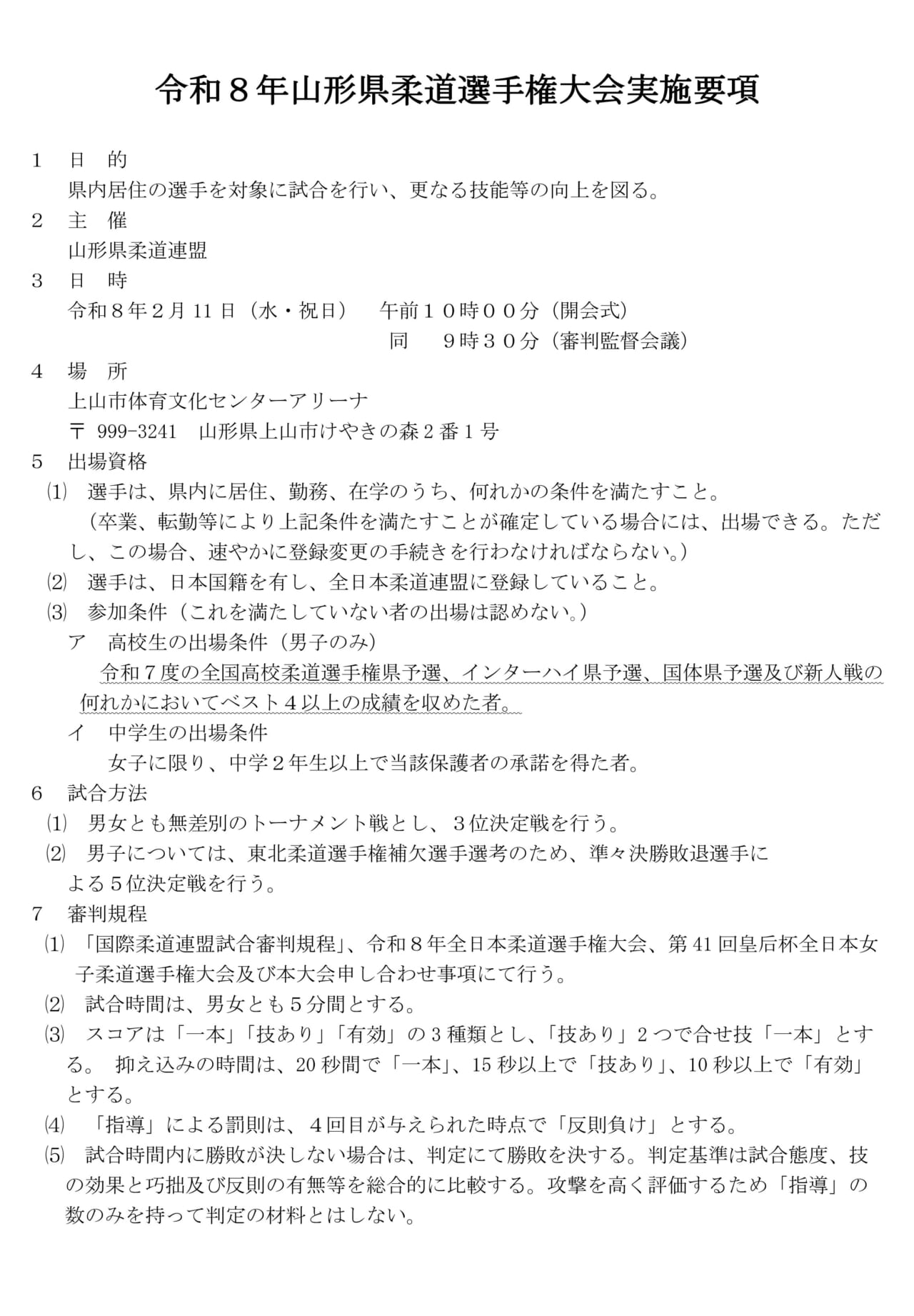 令和8年 山形県柔道選手権大会 実施要項 日時 令和8年2月11日(水・祝日) 大会名 山形県柔道選手権大会 会場 上山市体育文化センターアリーナ ダウンロード 令和8年 山形県柔道選手権大会 実施要項ダウンロード 申込みダウンロード